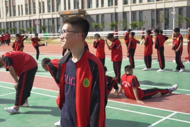 戴眼镜的学生在嵩山少林文武学校学武术,每天上课时间安排的很紧凑、合理,早上进行晨练,上午文化课,下午武术课,晚上晚自习,课程也非常丰富,充实的校园生活,将学生的精力都集中在学习上,安心在这里学习。